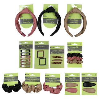 These adult faux leather hair accessories are assorted among 12 styles as shown and include headbands, scrunchies, and barrettes. They are attractive hair accessories givng you options for changing your hairstyles to wear casually and for dressing up. These accessories make great stocking stuffers and backto-school items.