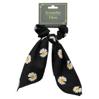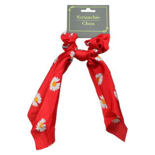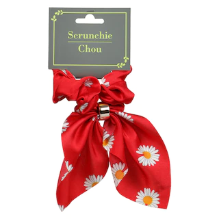 Assortment Details: Adult Hair Scrunchies with Daisy Pattern assorted between 2 different styles and among black, red, and cream colors.