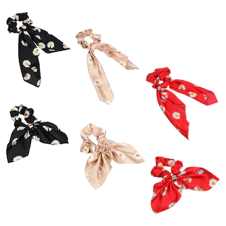 Enjoy these adult hair scrunchies in this simple and pretty daisy pattern. They are assorted among red, black, and cream and between 2 styles of scrunchy.