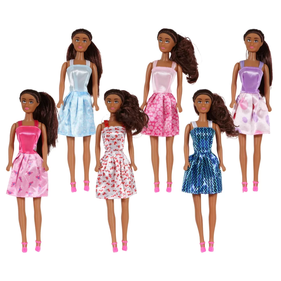 Assortment Details: 11.5-in. African American Fashion Dolls assorted among six different dolls that each have their own unique dress, but they all wear the same stylish pink pumps.