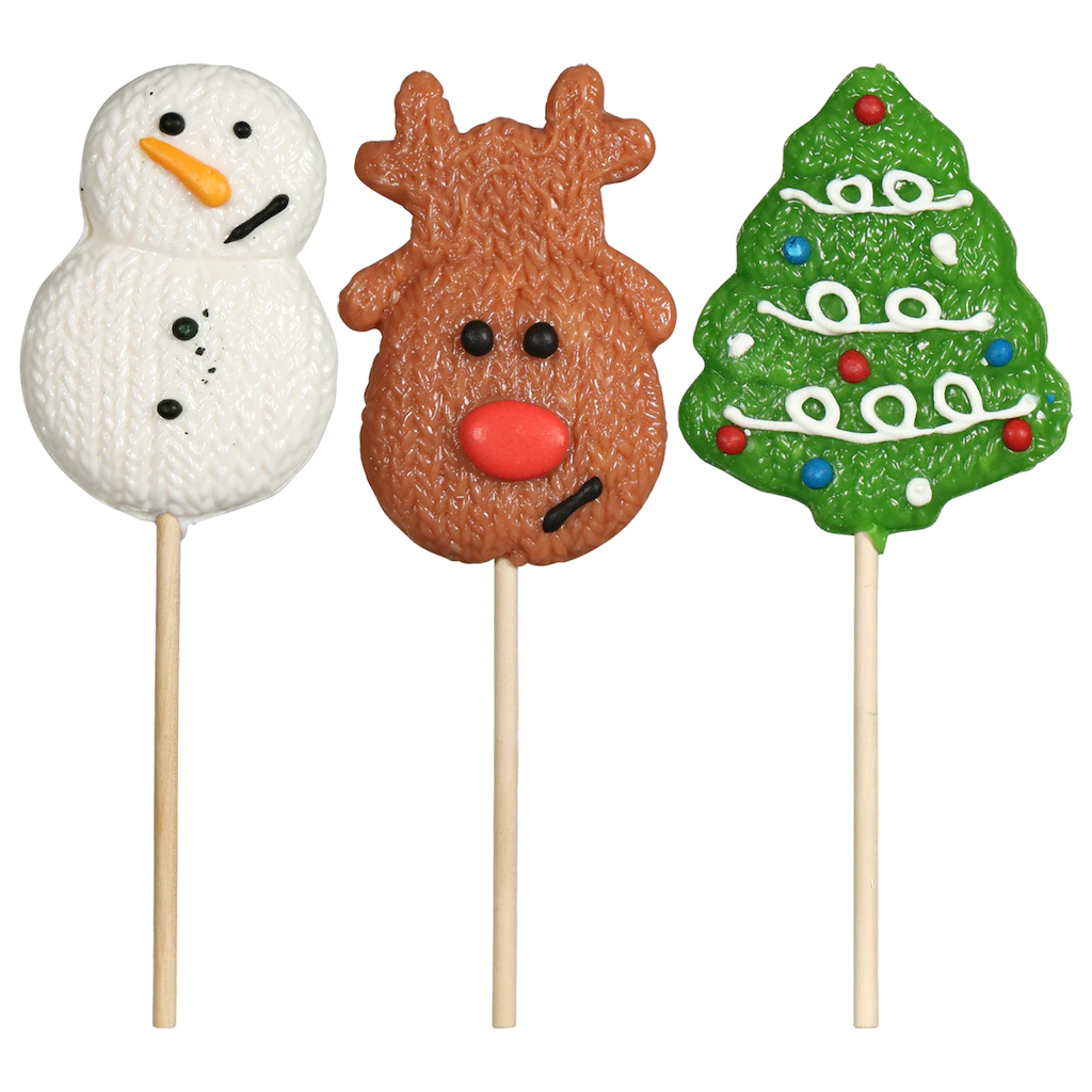 Assortment Details: Amos™ Decorated Christmas Lollipops assorted among snowmen, reindeer, and Christmas trees