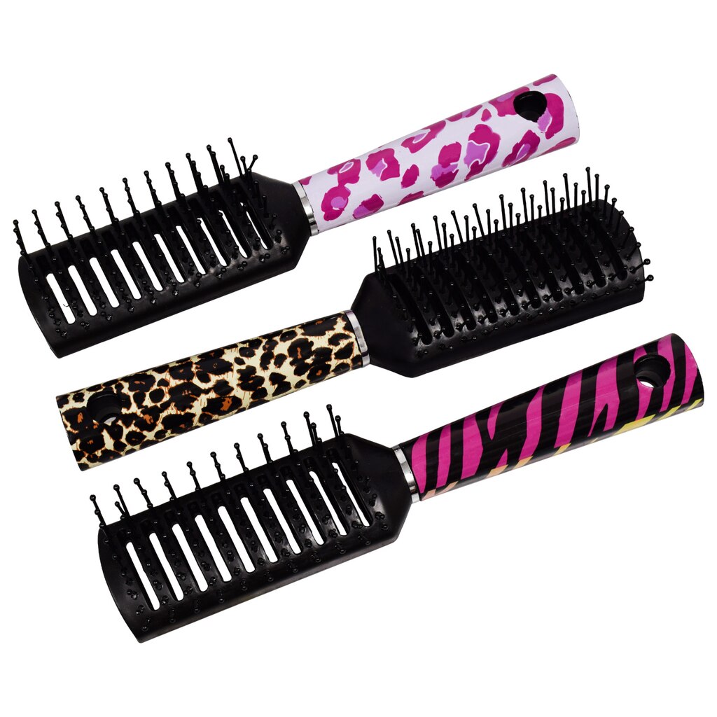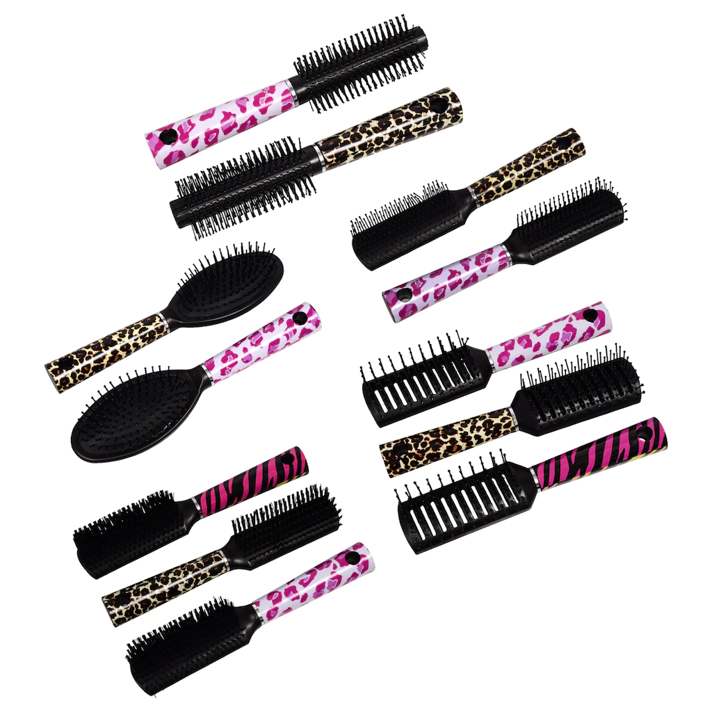 An assortment of brushes to meet all of your beauty needs! Each case is assorted among four styles, and each animal print brush has plastic bristles with smooth, rounded tips to protect hair and scalp while brushing and styling.