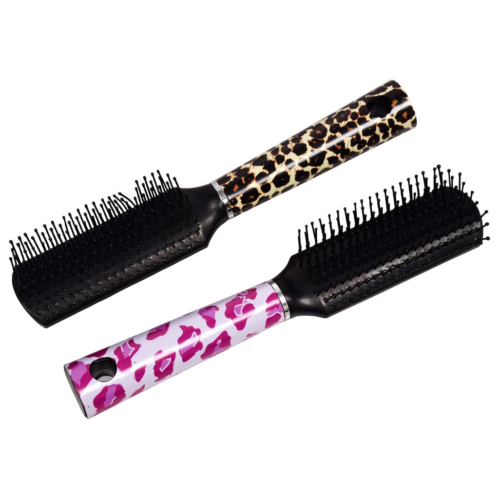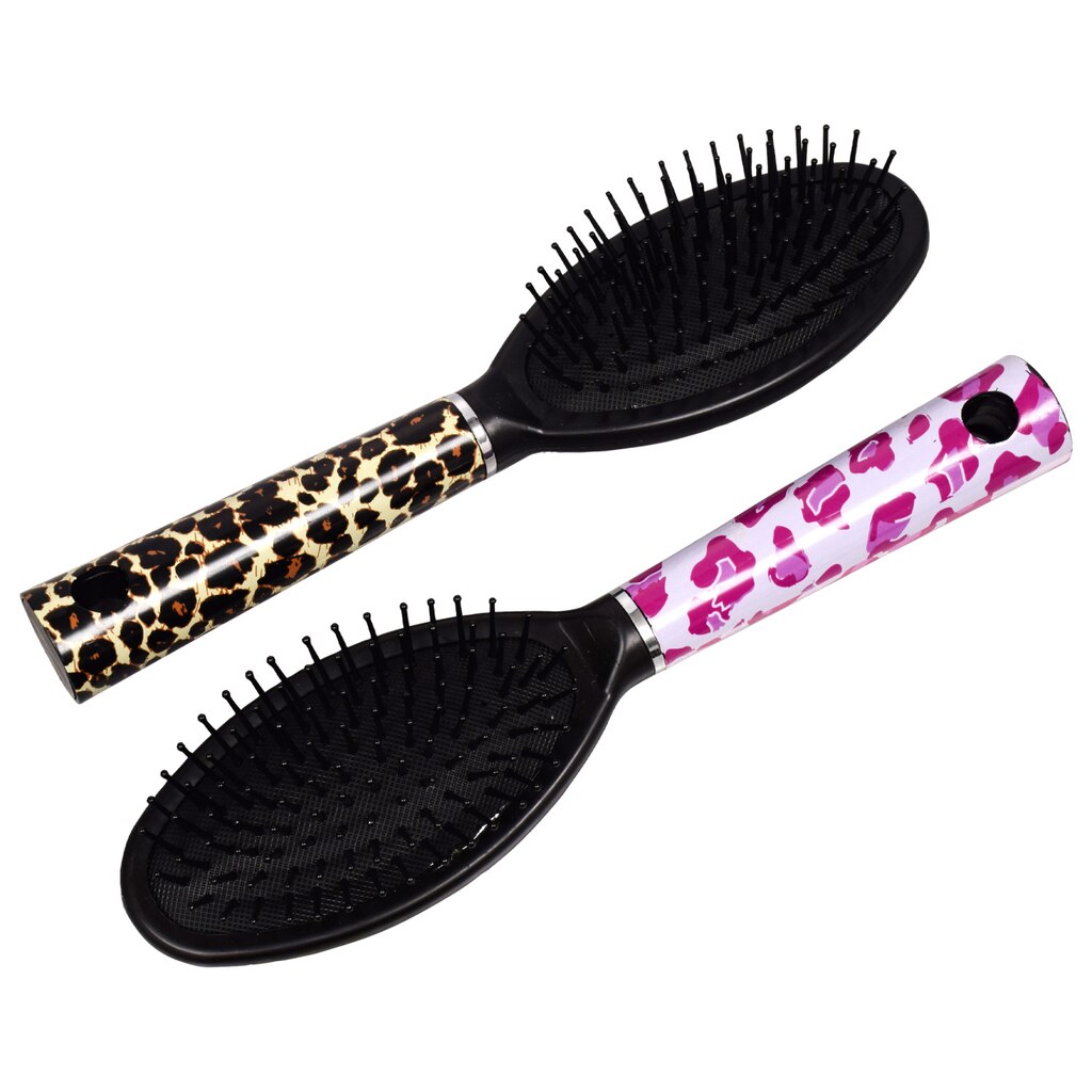 Assortment Details: 8.375-in. Animal Printed Plastic Hair Brushes assorted among 3 brush styles in leopard print, pink leopard print, and pink zebra print