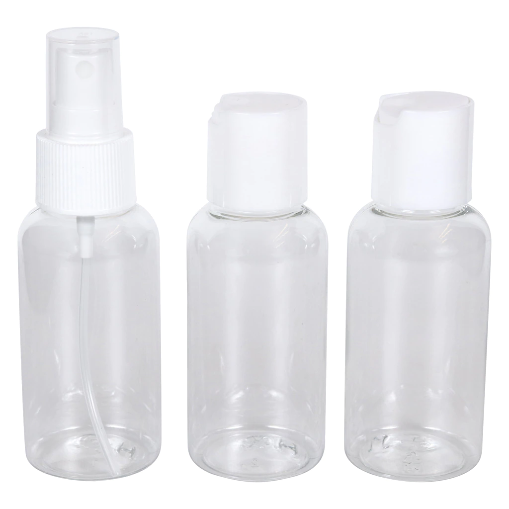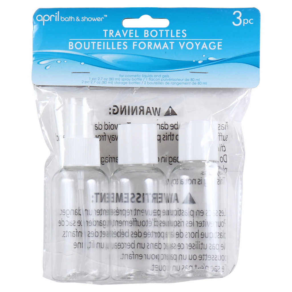 Assortment Details: 3-ct. Packs of April Bath & Shower™ Clear Plastic Travel Bottle Sets assorted between packs with 1 spray bottle and 2 storage bottles, and packs with 3 storage bottles.