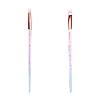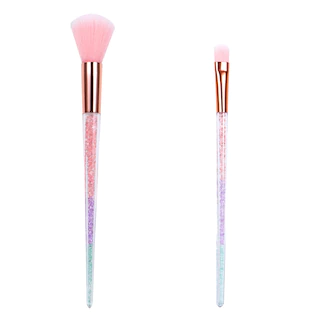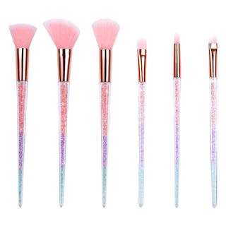 Use these colored crystal-handled brushes to apply your makeup confidently to achieve the look you desire. Makeup brushes come in 6 sizes and shapes that are sold individually. Each brush handle shows the colors of faux crystal with pink, purple, and blue colors transitioning. The brushes are assorted among a blush and a powder brush: 8×0.875-in., an angled contour brush: 8×0.625-in., a precision eyeshadow and a concealer brush:7×0.375-in.