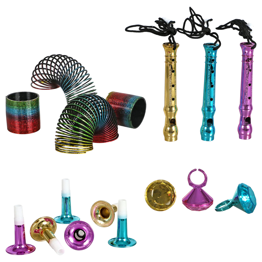 One great way to throw a killer party is to offer your guests fun favors to take home at the end of the night. With trinkets like these you can bet that your guests will be entertained and excited. These plastic party favors come in 4 lovely colors and 4 desirable designs: slinkies, whistles, noisemakers, and rings. Ages 3+.