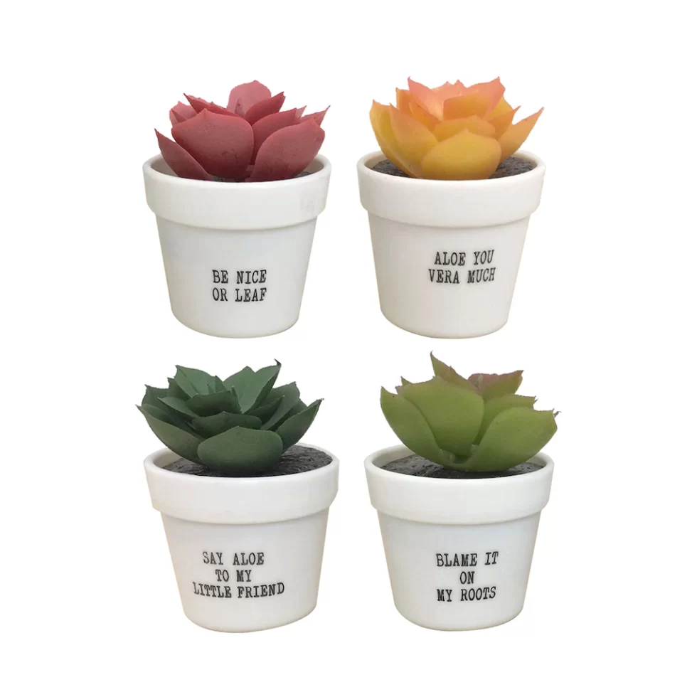 Happy homes have personal touches that help the space feel welcoming and warm. Choose any of these 4 potted succulents with inspirational sentiments on the side of the pot to add as decor in your space.