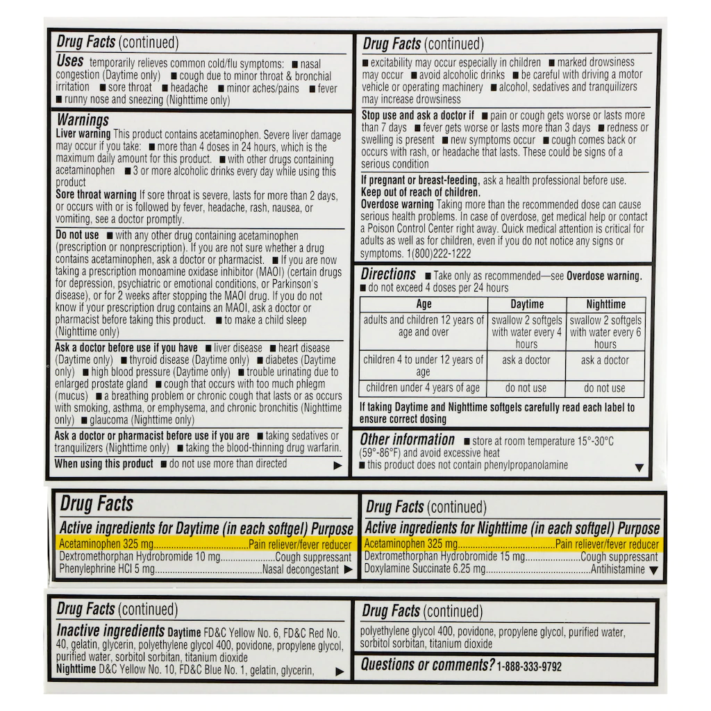Assured Multi-Symptom Daytime and Nighttime Liquid Capsules are round-the-clock treatment for cold and flu symptoms. Each box of multi-symptom liquid capsules contains 8 non-drowsy daytime softgels that treat fever, headache, sore throat, coughing, minor aches and pains, and nasal congestion. There are 4 nighttime softgels that treat fever, headache, sore throat, coughing, minor aches and pains, runny nose, and sneezing to help you get the rest you need.