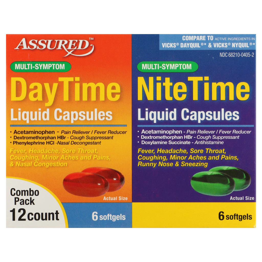 Assured Multi-Symptom Daytime and Nighttime Liquid Capsules, 12-ct. Packs