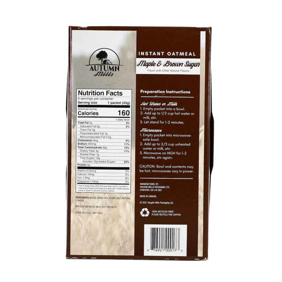 Assortment Details: 9.1-oz boxes Autumn Mills Maple & Brown Sugar Instant Oatmeal includes 6 envelopes of oatmeal.
