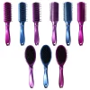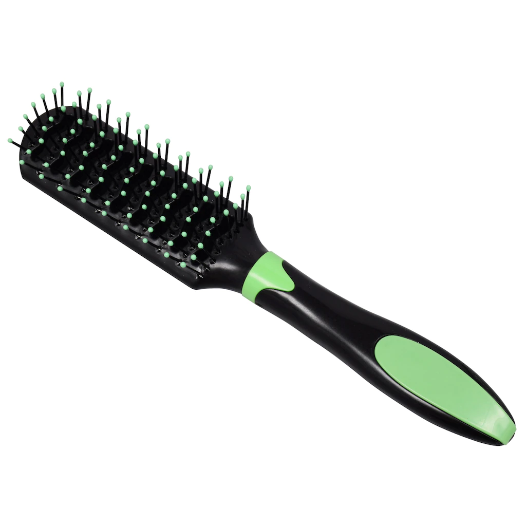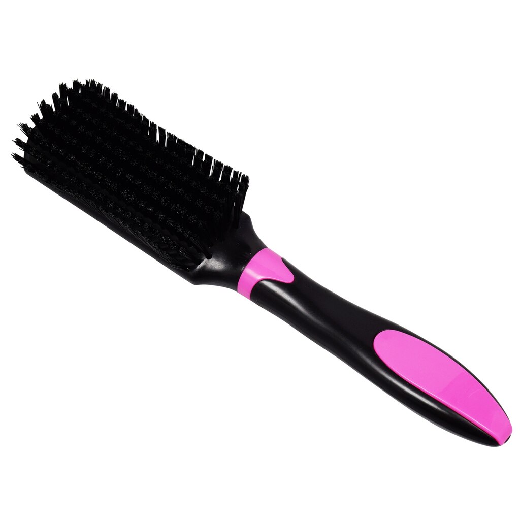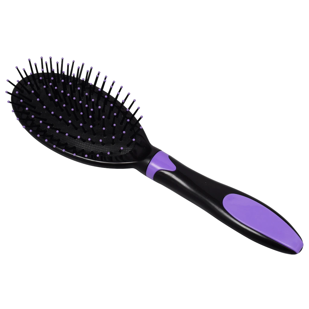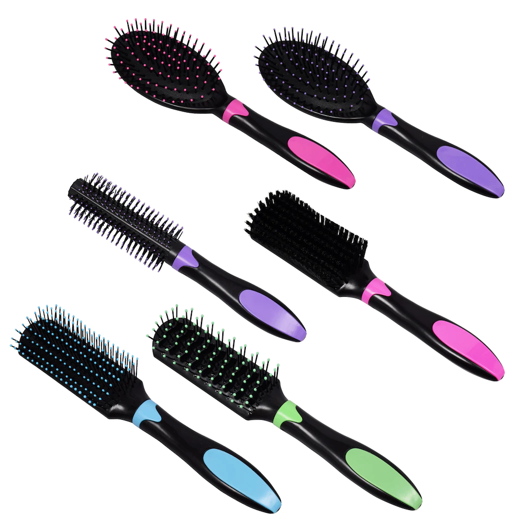 Assortment Details: Basic Solutions™ Colorful Plastic Hair Brushes assorted among purple, pink, green, and blue handles and the 4 brush styles shown