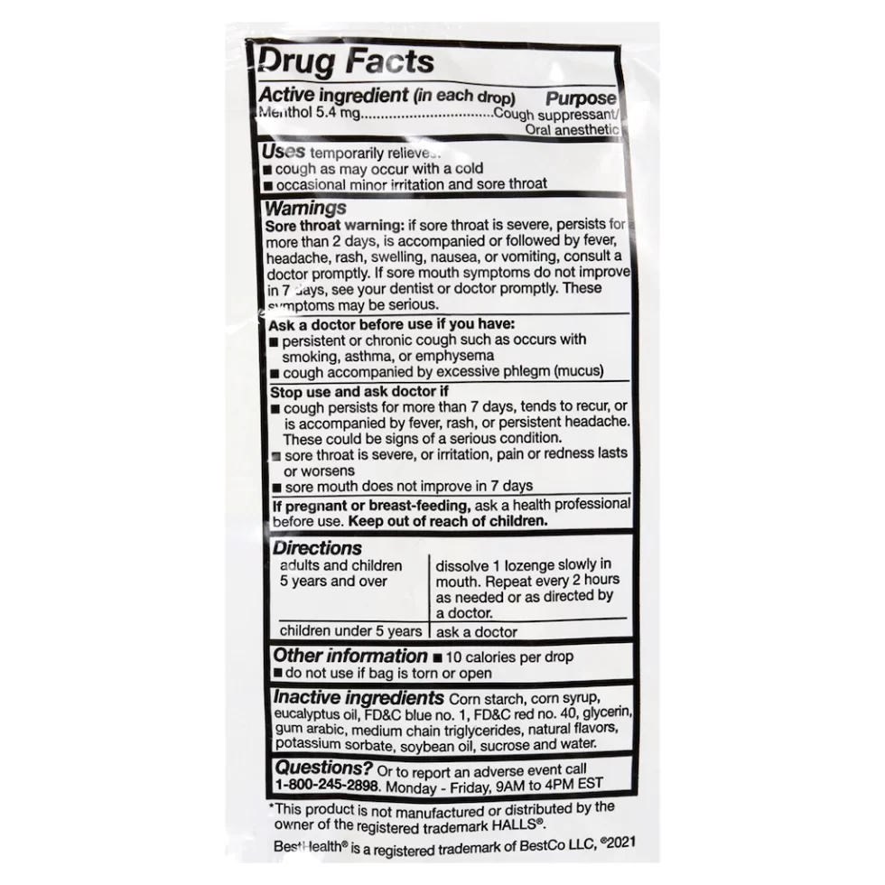 Assortment Details: 30-ct. bags. of Best Health Menthol Cough Drops