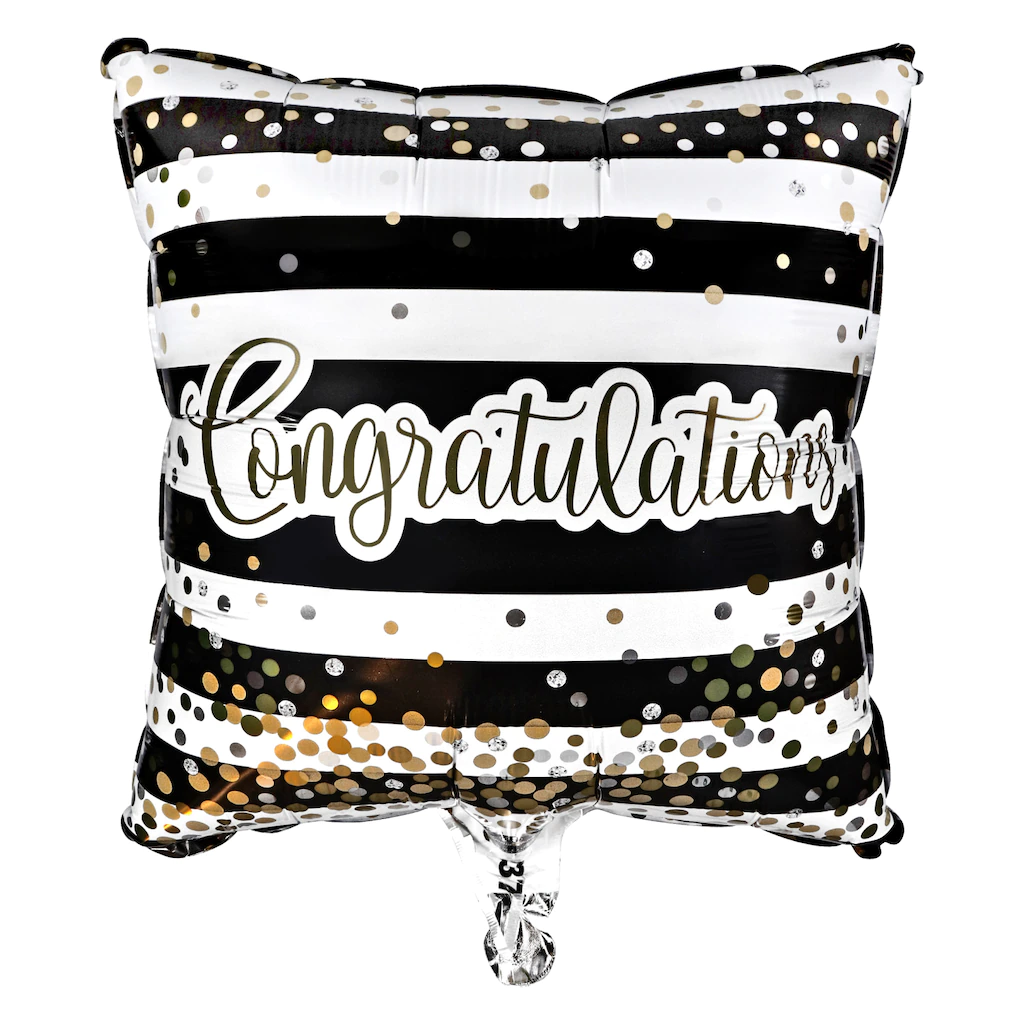 Assortment Details: 13.5xa13.5-in. Black and White Striped “Congratulations!” Foil Balloons