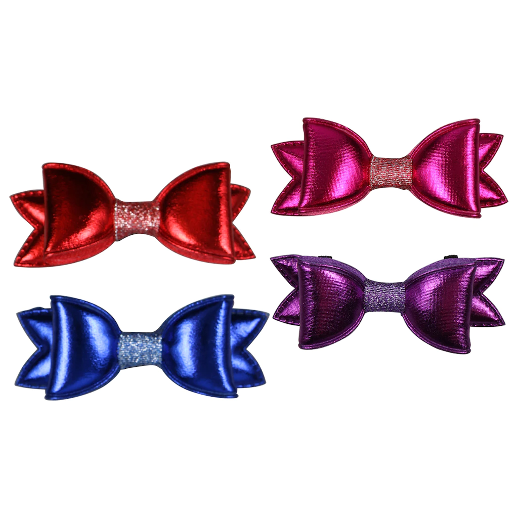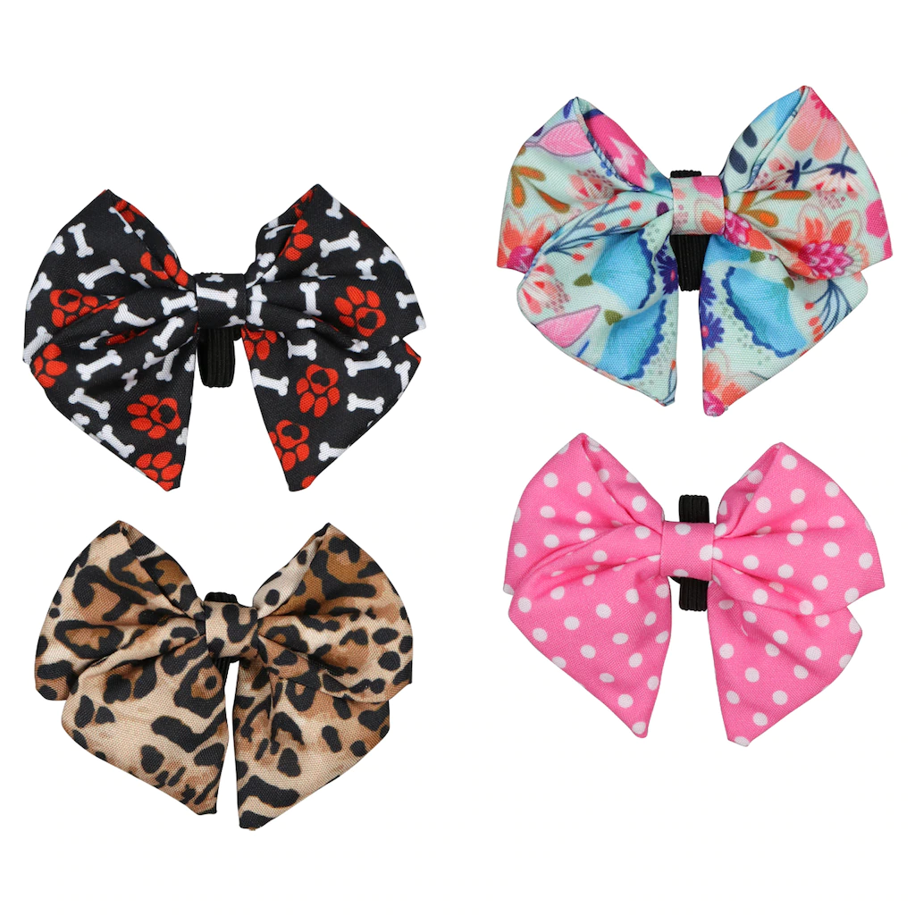 Give your fur baby an opportunity to dress up the collar. These bow dog collar accessory bows are easy to put on and take off of your dogs collar. They come in 2-pc. sets and are assorted among the 10 sets shown. They fit collar widths 3/8-in. to 5/8-in.
