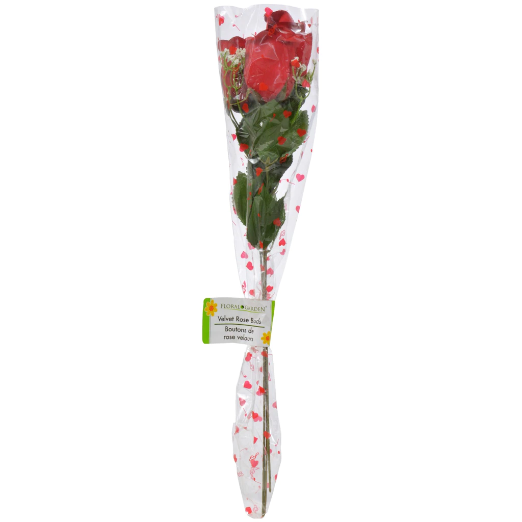 Say “I Love You” forever! Make a long-lasting impression with beautiful red velvet rose buds, which are accented with rich foliage and flexible 19-in. long stems… wonderful for crafts, floral arrangements, and centerpieces.