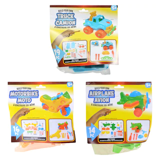 Assortment Details: 9×7.5×2-in., Build a Vehicle Toy Kits assorted among trucks, motorbikes, and airplanes.