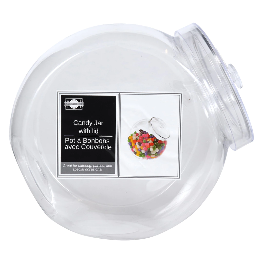 Assortment Details: 55-oz. Caterers Corner Clear Plastic Candy Jars with Lids