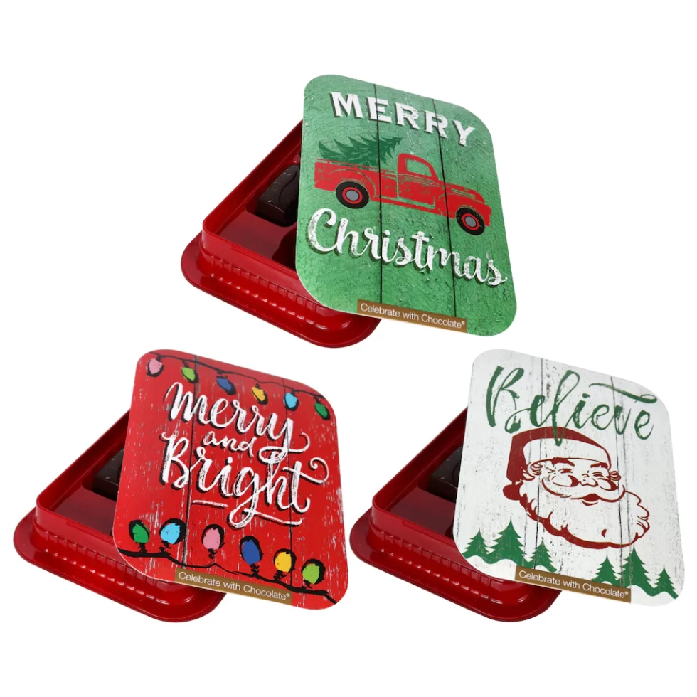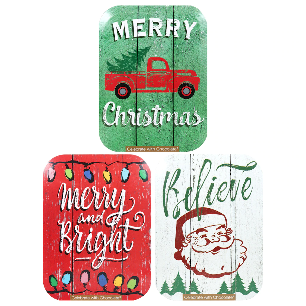Assortment Details: 1.6-oz. Celebrate with Chocolate® Rustic Christmas Candy Boxes assorted among the 3 designs shown