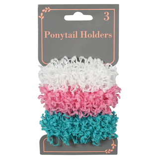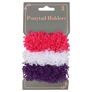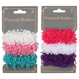 Assortment Details: 3-ct. Packs of Children’s Fuzzy Scrunchies assorted between white, light pink, and aqua blue, or hot pink, white, and purple
