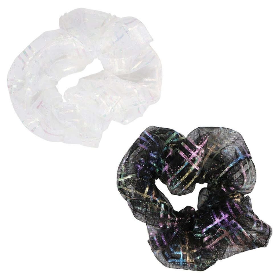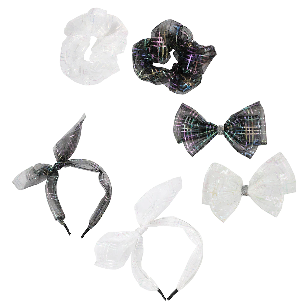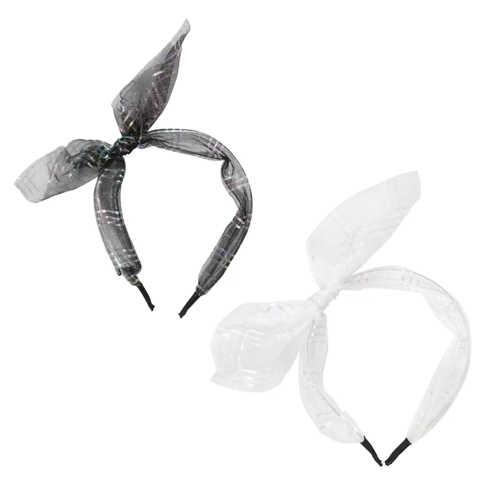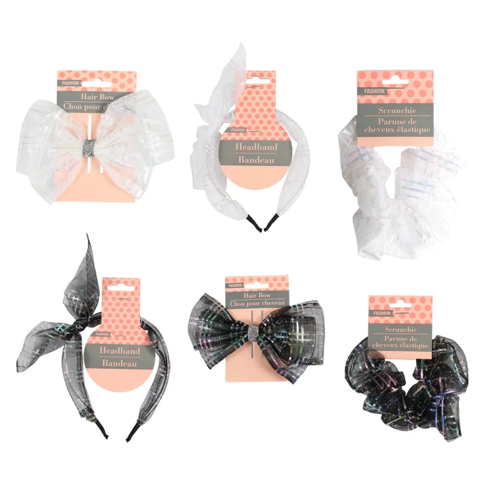 Assortment Details: Childrens’ Sheer Fabric Hair Accessories assorted among head bands, hair clips, and scruncheese in the two styles shown.