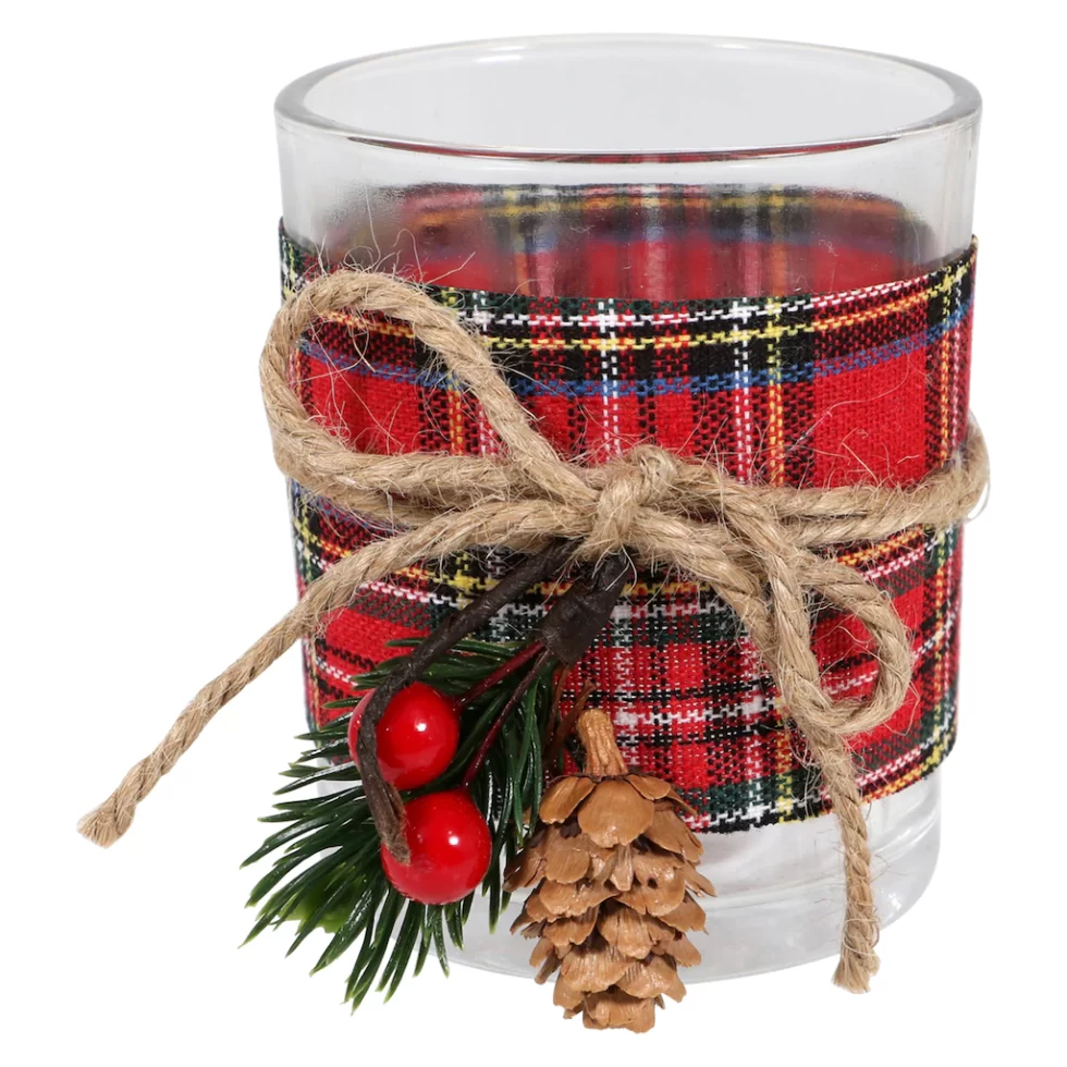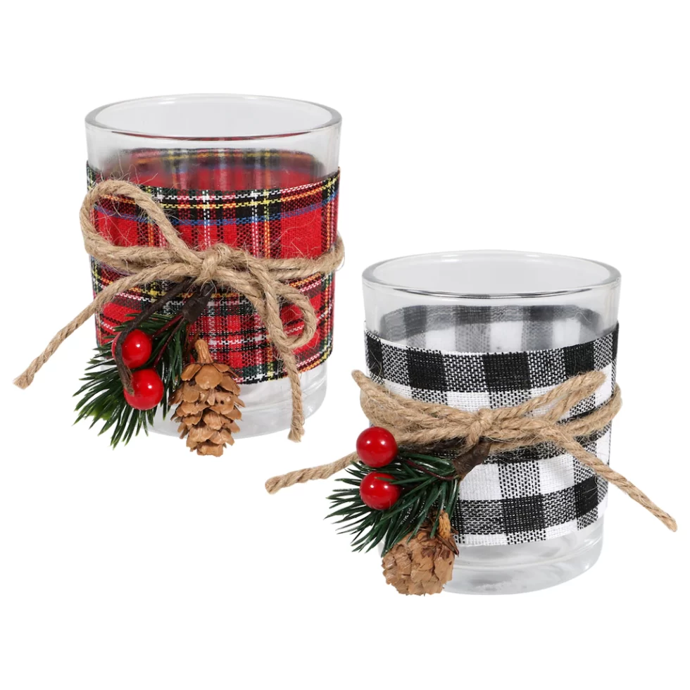 Assortment Details: 2.76×4.130×3.310 in. Christmas Decorated Candle Holders assorted between red plaid and black buffalo checks