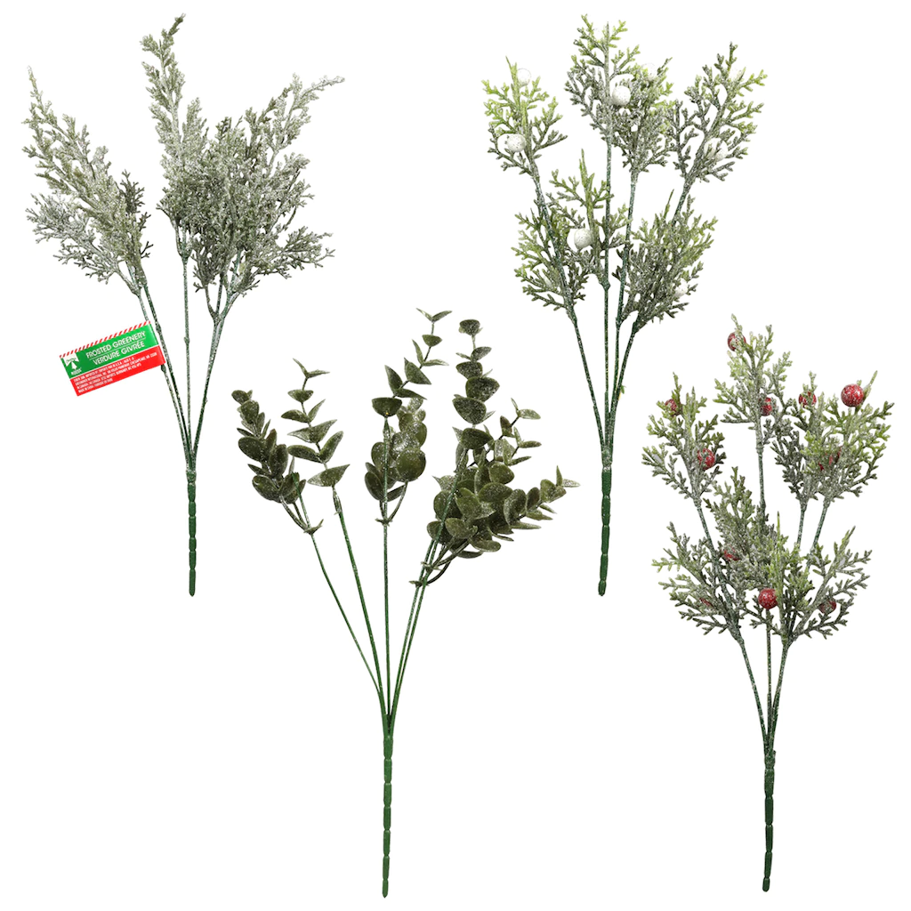 Assortment Details: 15.25-in. Christmas House™ 6-Stem Frosted Greenery assorted among the 4 styles shown