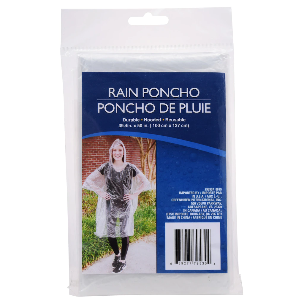 Assortment Details: 39.375×50-in. Clear Plastic Rain Ponchos
