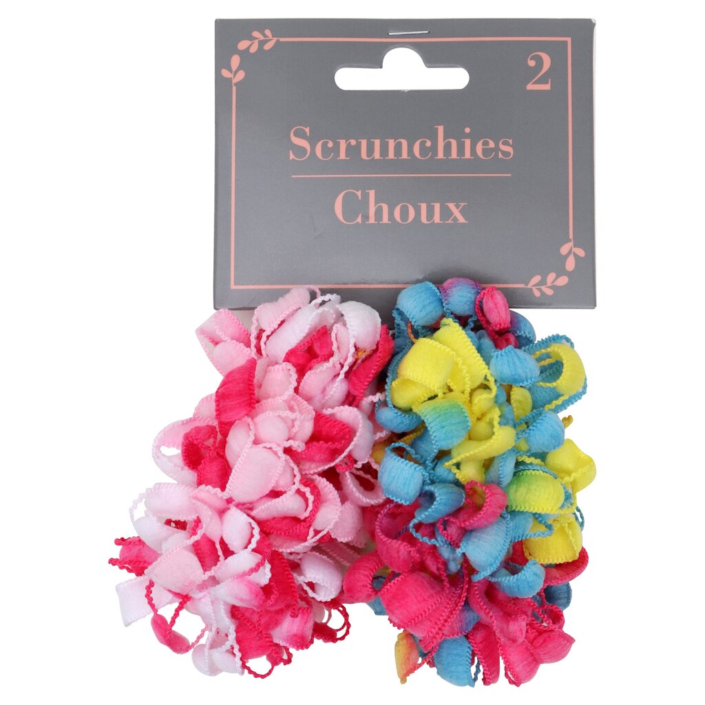 Assortment Details: 2-ct. Packs of Colorful Hair Scrunchies for Kids assorted between pink and multicolored, and blue and black/white