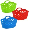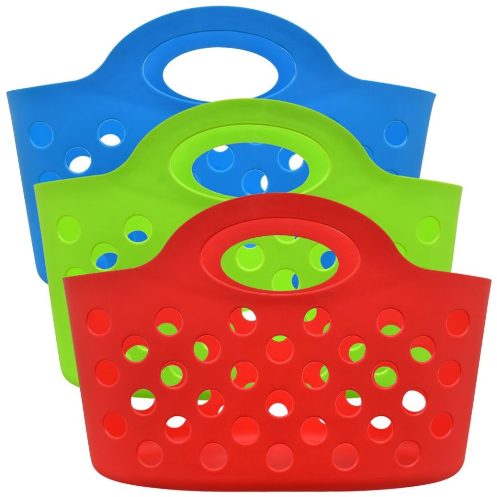 Assortment Details: Colorful Plastic 11.875×7.875×7.625″ Oval Carry Totes assorted among 3 bright colors; red, blue, and green.