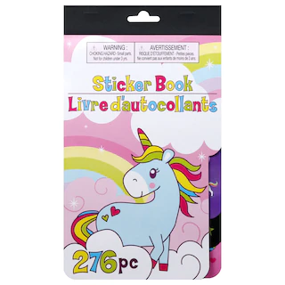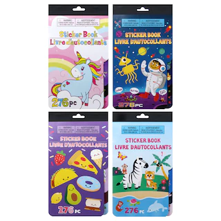 Assortment Details: 276-ct. Packs of Colorful Sticker Books assorted among unicorns, space, food, and zoo animal themes