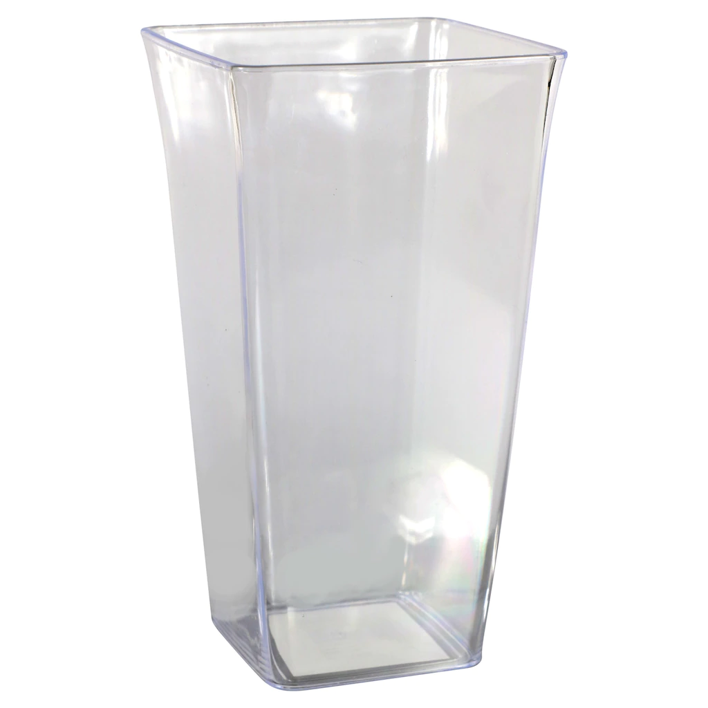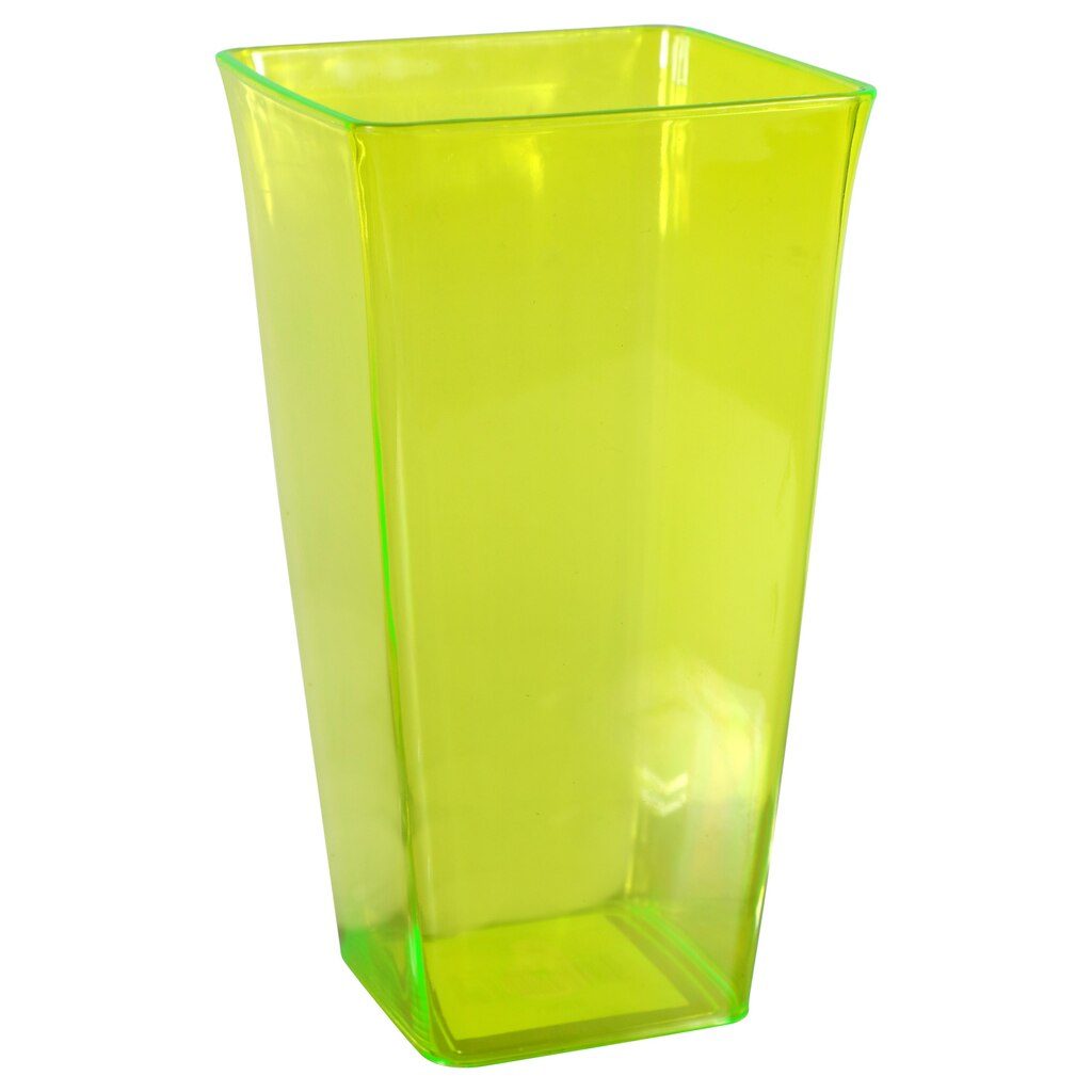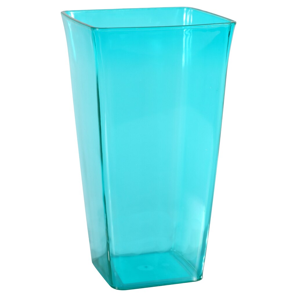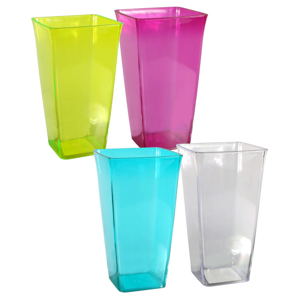 The stylish look of colorful glass with all the convenience of plastic! Plastic construction means less breakage during floral deliveries. Vases measure 4x4x7.25-in. and the colors are assorted among green, blue, clear, and fuchsia. Excellent for florists, gift shops, and outdoor event planners.