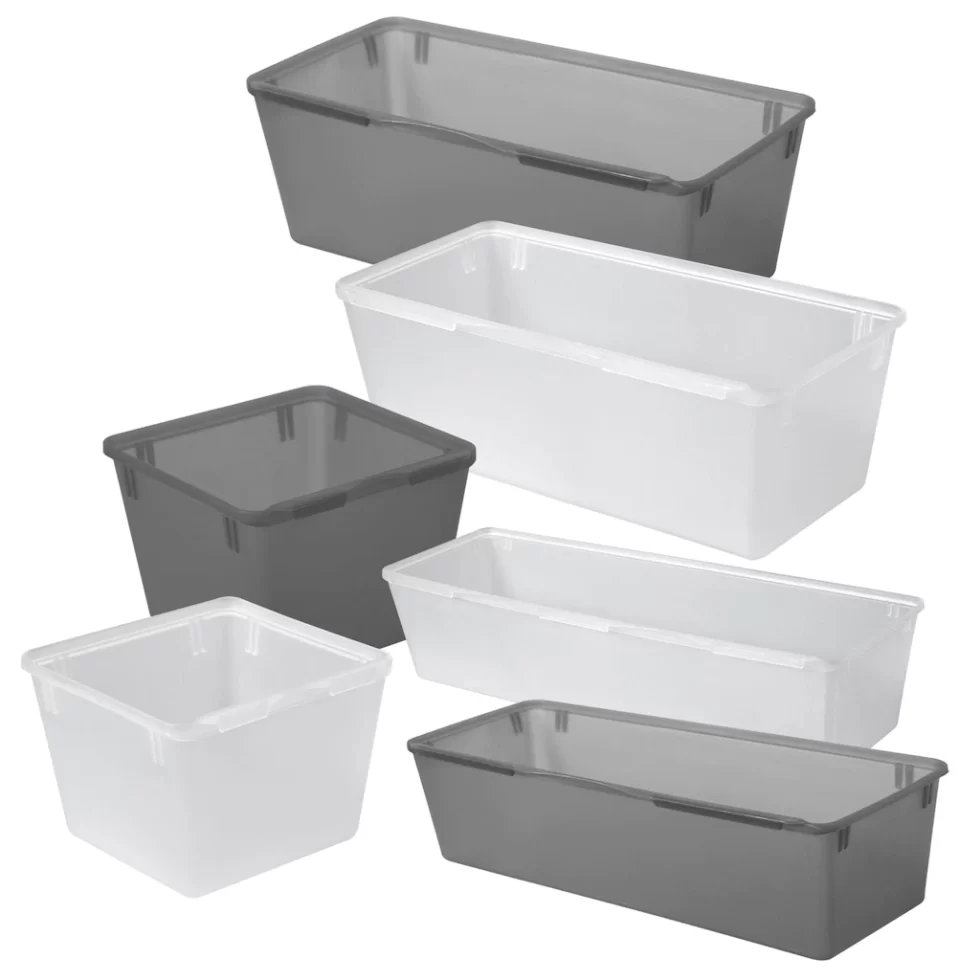 Assortment Details: Plastic Drawer Organizers assorted between gray and white in 3 sizes: 3-ct. packs of small 4x4x4-in., 2-ct. packs of medium 8x4x3.25-in., and large 11.75x4x3-in. organizers.