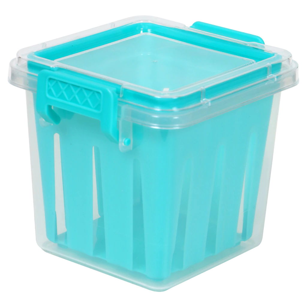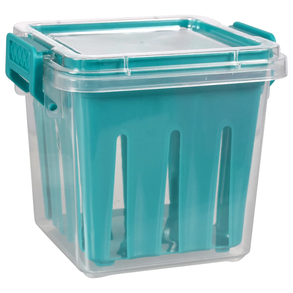 Assortment Details: 4.625×4.375×4-in. Cooking Concepts™ Plastic Veggie Storage Containers assorted among red, blue, aqua blue, and gray