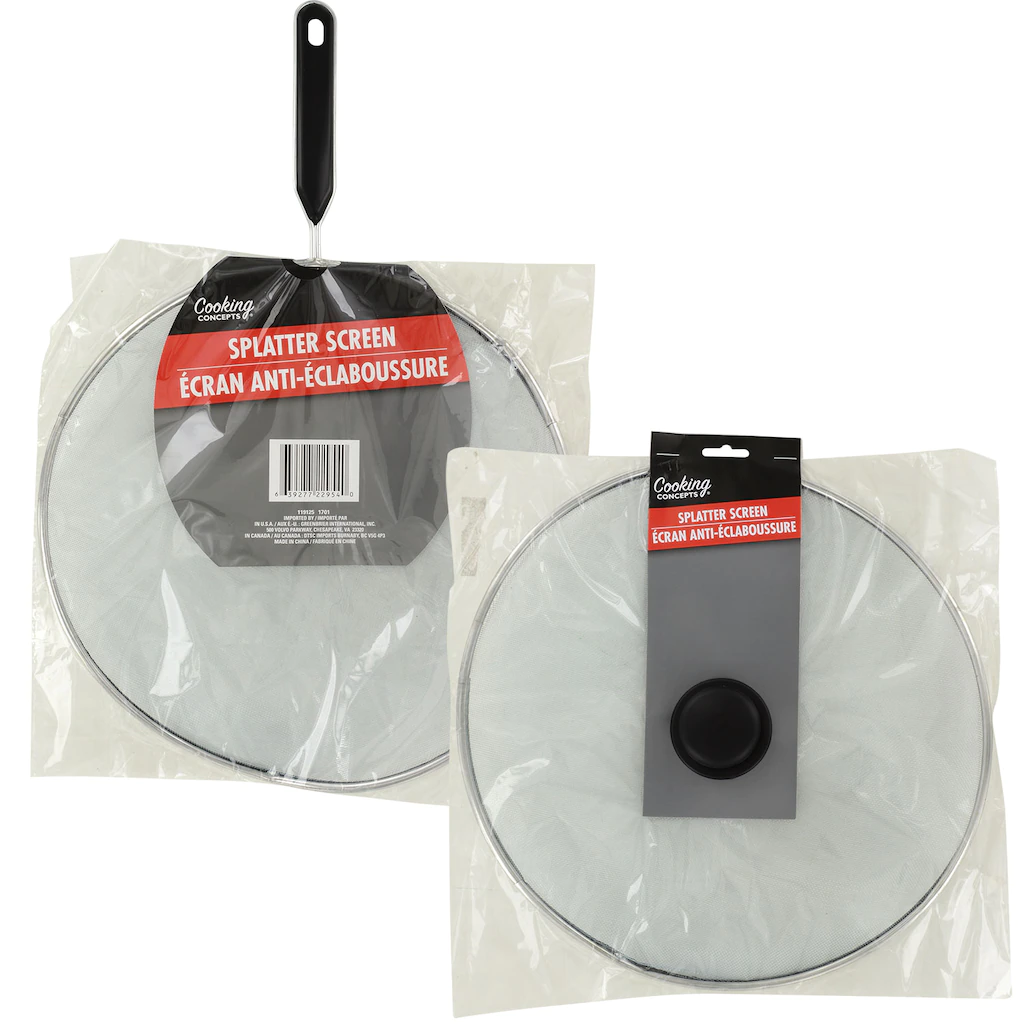 Assortment Details: 11.25-in. Cooking Concepts® Splatter Screen assorted between screens with long handles and screens with knobs.