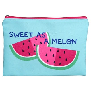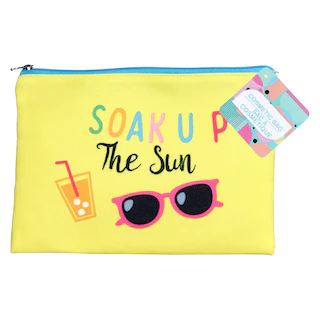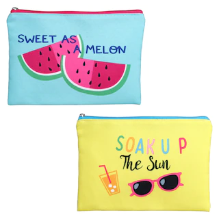 Assortment Details: 7.5×5.75-in. Cosmetic Pouches with Beachy Designs assorted between “Sweet as a Melon” (blue) and “Soak up the Sun” (yellow)
