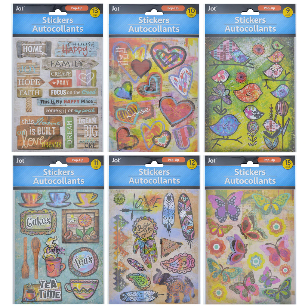 Collect all of these adorable watercolor pop-up stickers. They are great for prize boxes, giveaways, Easter basket stuffers, crafting, scrapbooking, and resale. Each pack includes between 9-15 stickers assorted among 6 different themes. Assortment may vary.