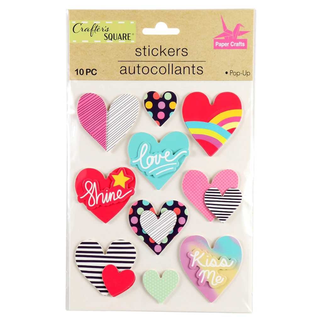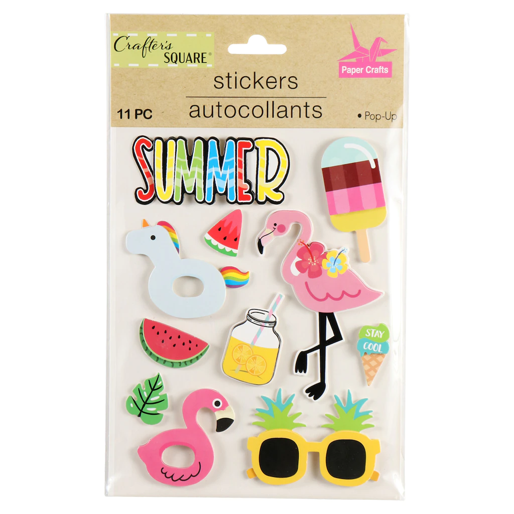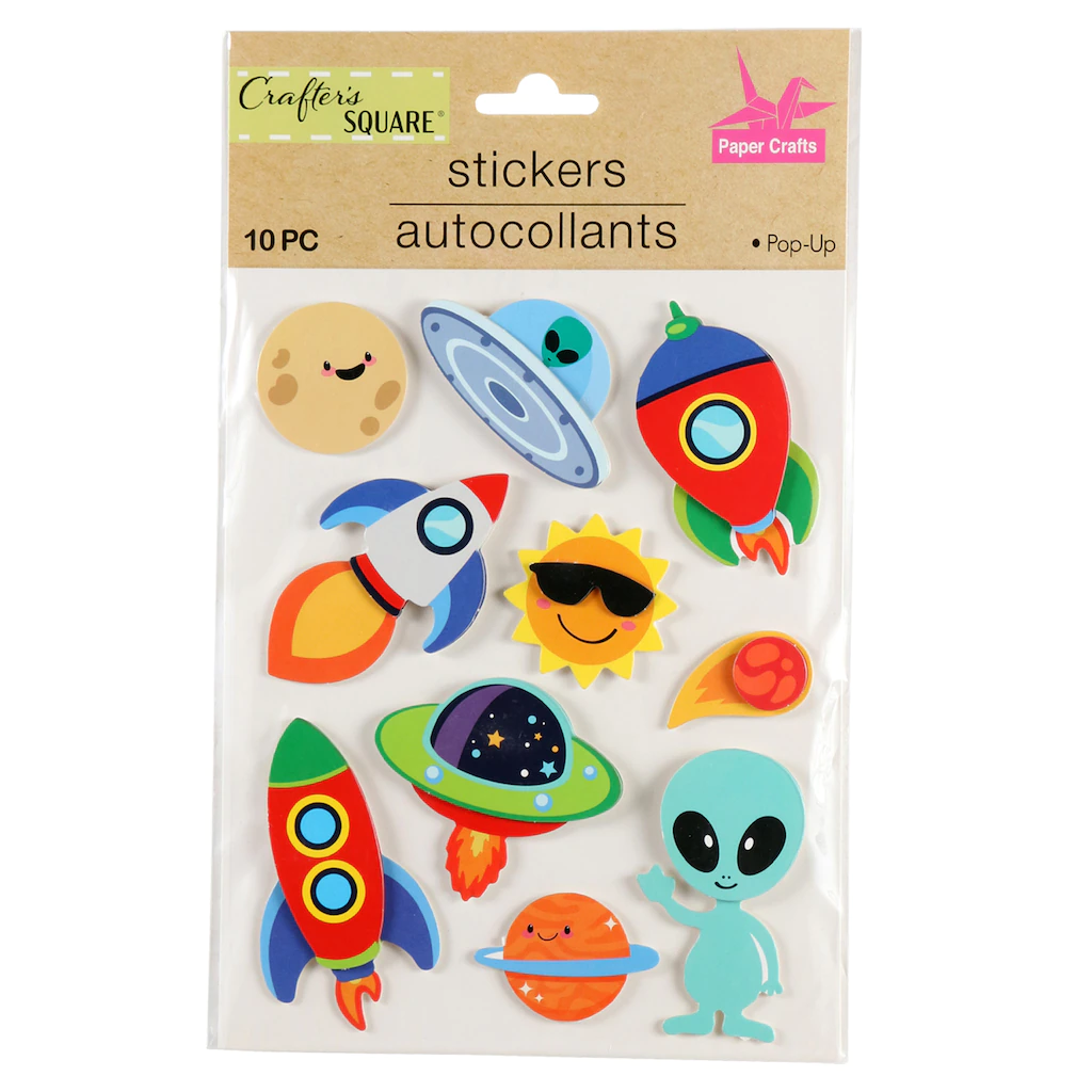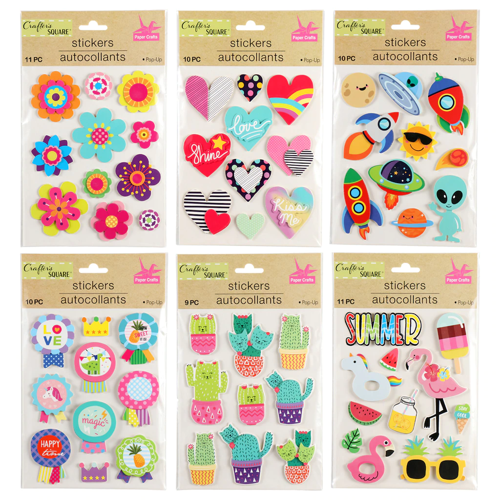 Assortment Details: 7.25×5.625-in. sheets of Crafter’s Square® Die-Cut Pop-Up Stickers assorted among 11-ct. packs of flower-themed stickers, 10-ct. packs of heart-themed stickers, 10-ct. packs of space-themed stickers, 10-ct. packs of award-themed stickers, 9-ct. packs of cactus-themed stickers, and 11-ct. packs of summer-themed stickers. Assortment may vary.