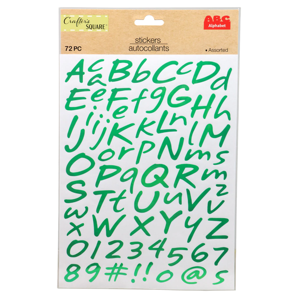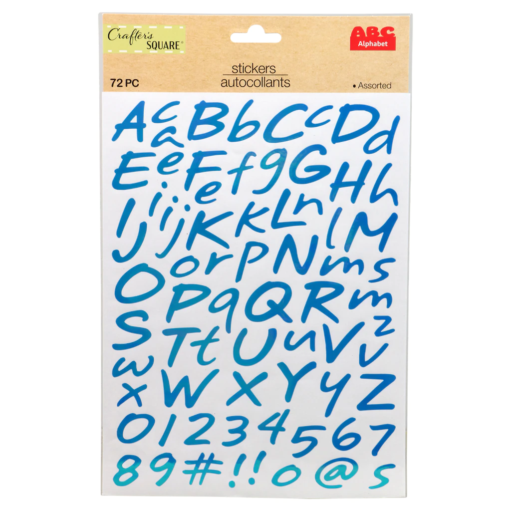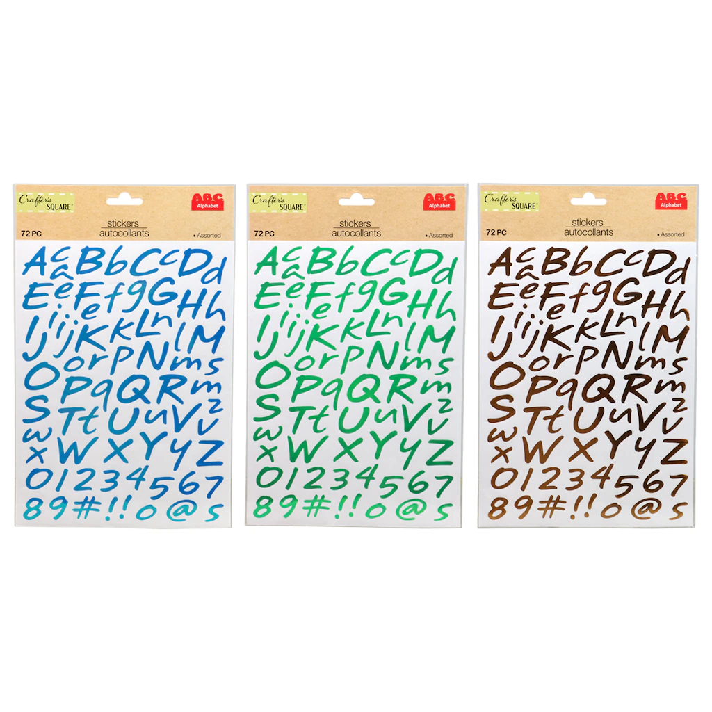 Assortment Details: 72-ct. packs of Crafter’s Square® Foil Alphabet Stickers assorted among blue, brown, and green.