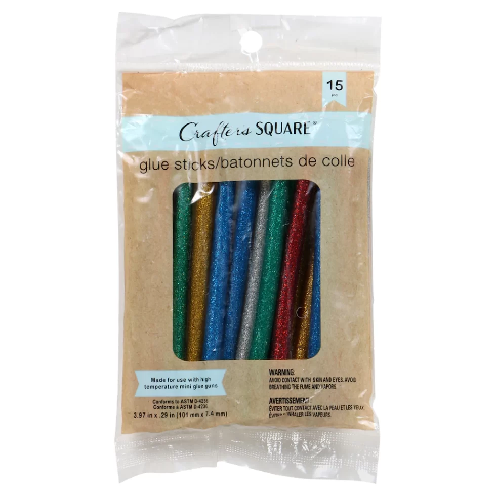 Upgrade your crafting with these Crafter’s Square® Mini Glitter Hot Glue Sticks! Made for use with high temperature mini glue guns, these 15-ct. packs of 4-in. hot glue sticks will keep you gluing all day long. Each pack includes gold, silver, red, blue, and green 0.25-in. dia. glue sticks. Great for making wreaths, homemade costumes, school projects, and more! Warning: Avoid contact with skin and eyes. Avoid breathing the fume and vapors.