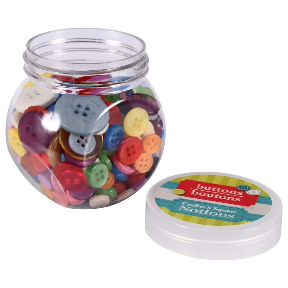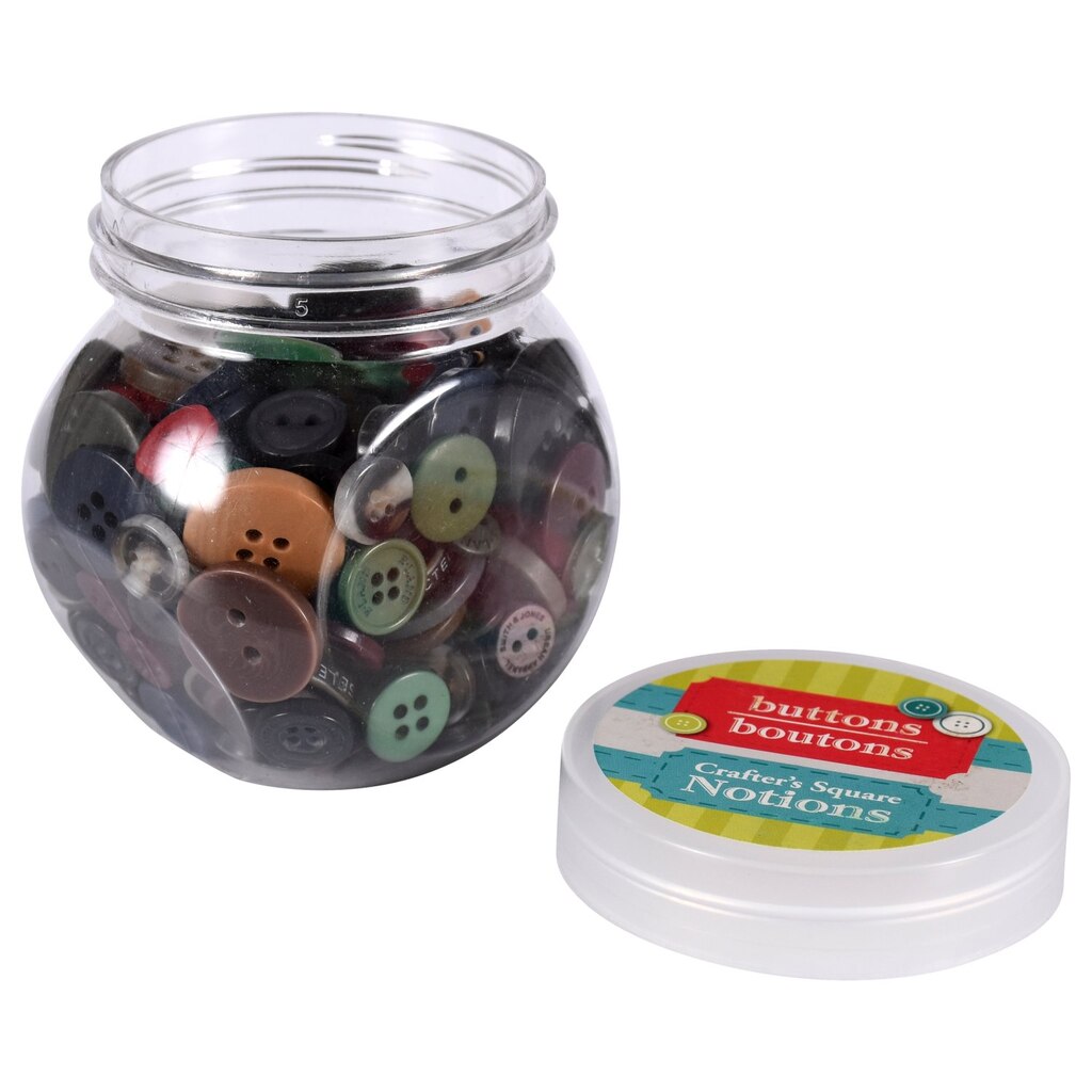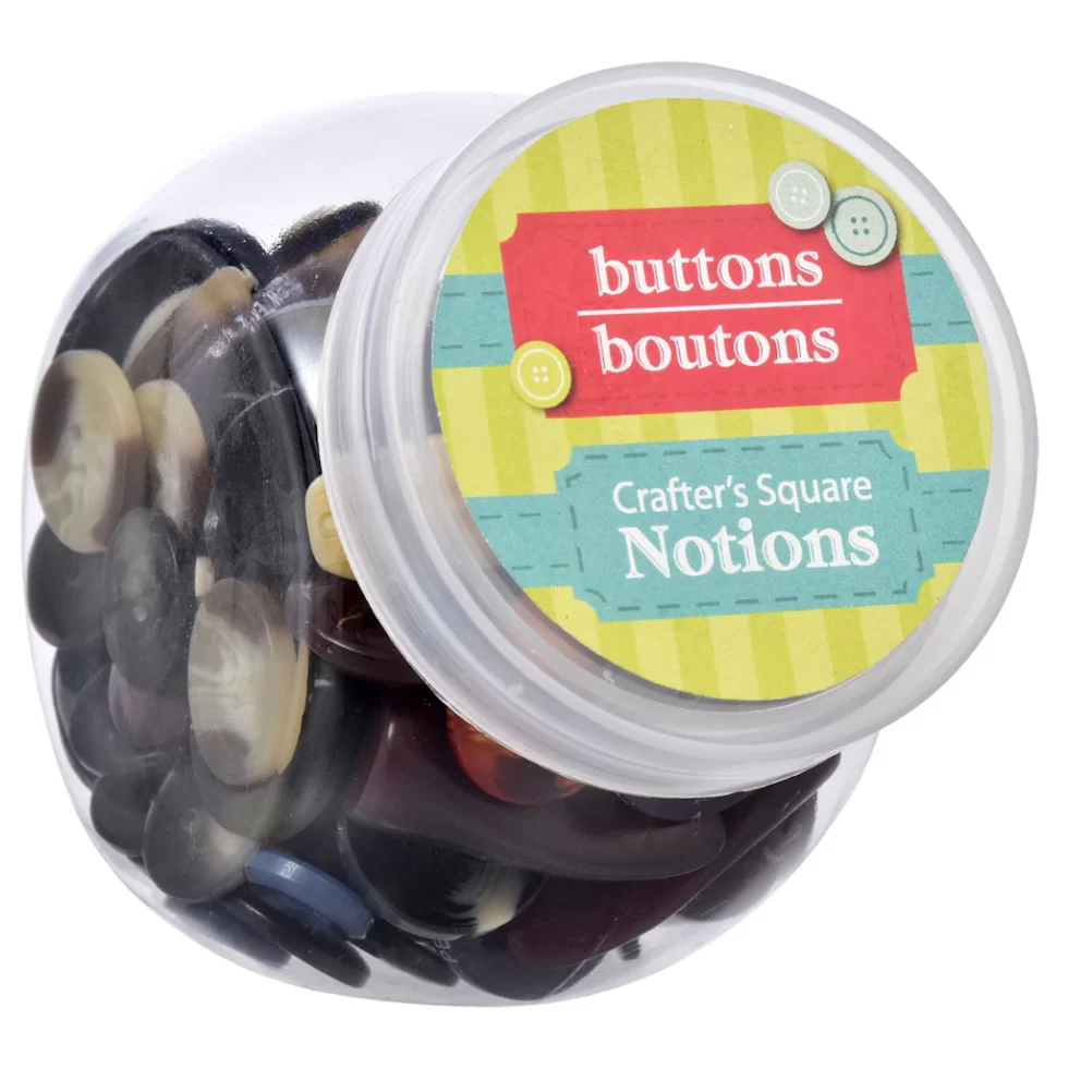 Assortment Details: 2.8-oz. Crafter’s Square® Notions Craft Button Jars assorted between dark & neutral buttons and multi-color buttons