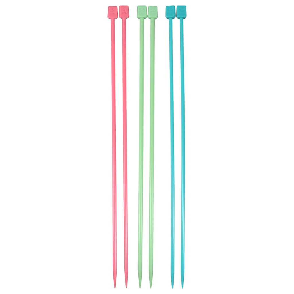 Assortment Details: 2- ct. packs Crafter’s Square® Single Point Knitting Needles assorted among 3 different sizes and three colors as shown.
