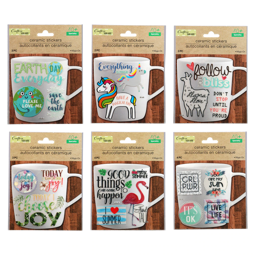 Crafter’s Square Water & Heat Resistant Stickers are ideal for personalizing any ceramic mug for yourself or to be given as gifts. Each set has 4 stickers and the sets are assorted among the six styles shown. These stickers are heat and water resistant and are perfect for creating one-of-a-kind gifts.