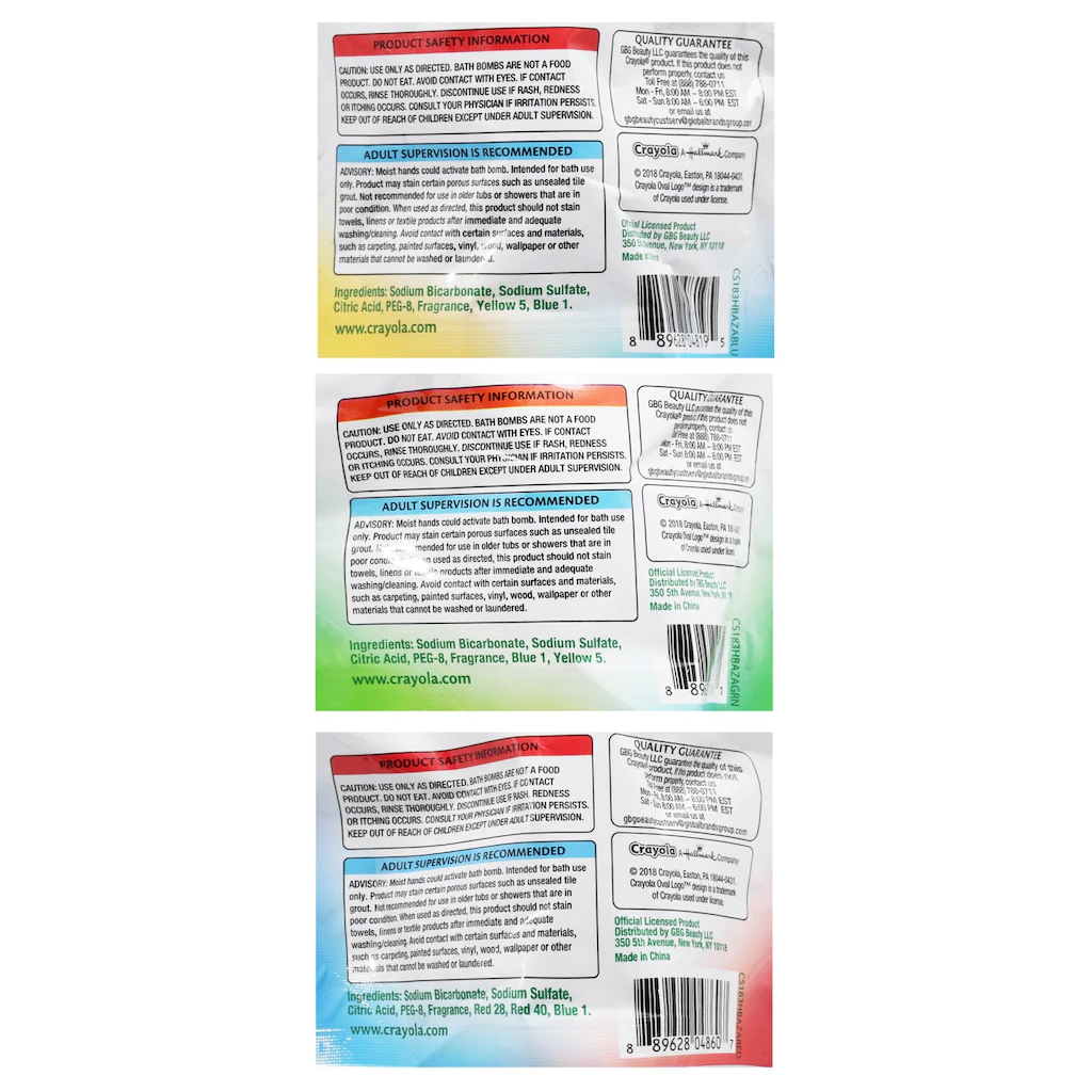 Have some fun in the bath next time! enjoy the color fizziness of these bath bombs assorted among green, blue, and pink. Bags contain _-oz. of bath color to soak and relax in. Ideal for resale in super centers, home goods stores, and bath specialty shops. Ages 3+.