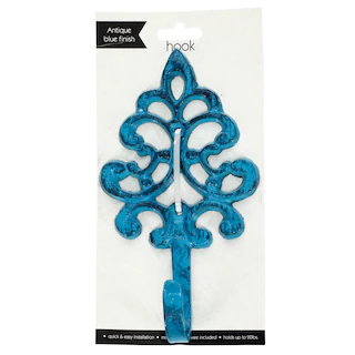 Assortment Details: 6.25×3.5×1.25 in. Decorative Metal Wall Hooks assorted among white, blue, and antique brass finish
