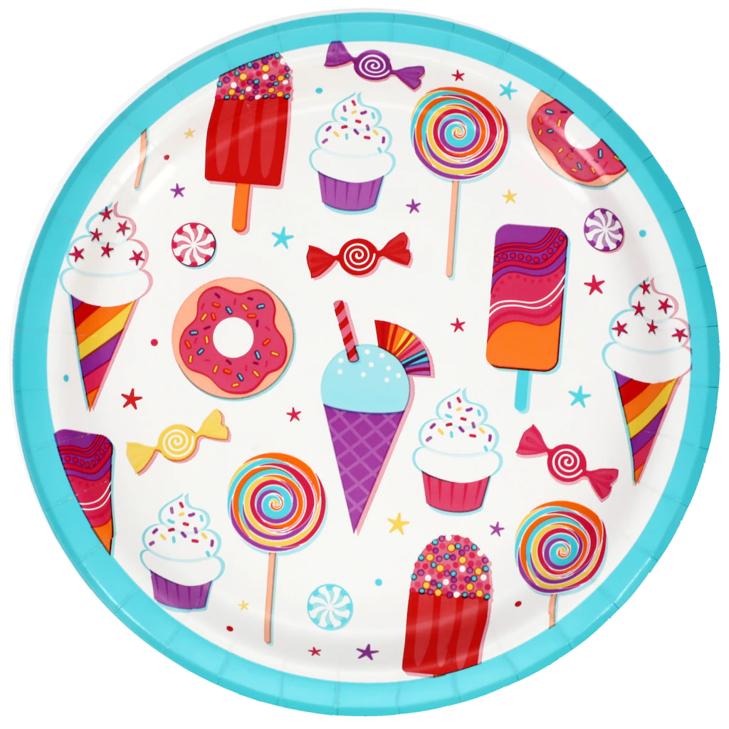 What’s a birthday party or celebration without your favorite desserts? These 9-in. round colorful paper party plates are decorated with all of your favorite sweet treats, such as candy, cupcakes, ice cream cones, doughnuts, and lollipops. 9-in. plates are the perfect size for meals, appetizers, and snacks, and pair perfectly with our Dessert Party lunch napkins for the perfect party table. Or, mix and match with our other solid-color party supplies. Plus, easy disposable plates make cleanup a breeze.