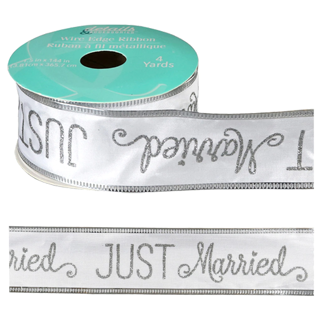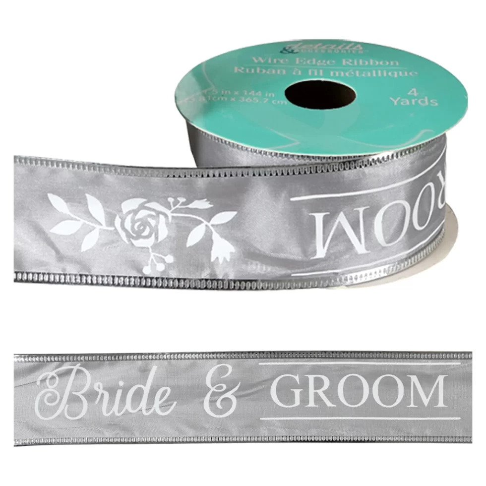 Create beautiful gift bows, decorate baskets, accessorize table decor, accent floral arrangements, and so much more with these 4-yd. rolls of Details and Accessories™ Wire Edge Wedding Ribbon! Each roll is 1.5-in. wide and features wire edges to hold shape. Assorted among the six marriage-themed styles shown, including “bride & groom” and “just married sentiments,” this ribbon is perfect for your wedding day decorations, bridal shower gifts, and wedding presents!
