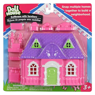 Assortment Details: 5.875×4.75×2.125 in. Doll House with Furniture and People assorted between white houses with pink roofs & purple furniture and Pink houses with purple roofs & pink furniture.