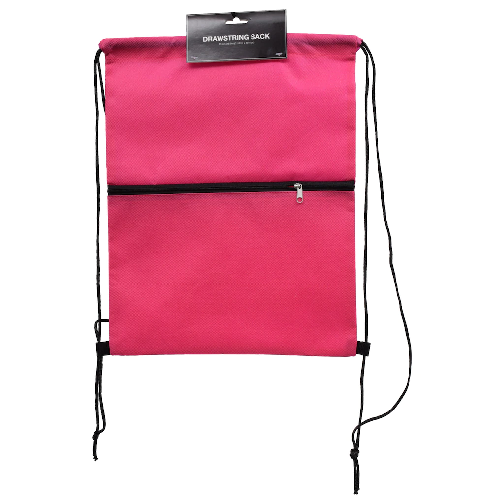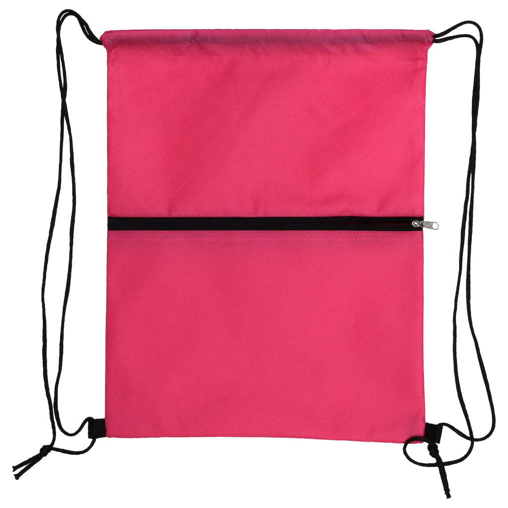 Assortment Details: 17×13-in. Drawstring Backpacks with Zipper Pockets assorted among pink, red, black, and blue