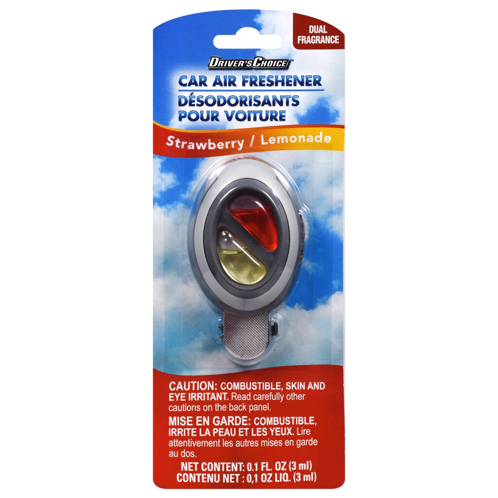 Assortment Details: 0.1-fl.oz. Drivers Choice® Dual Scented Car Air Fresheners assorted among strawberry/lemonade, new car/ocean breeze, and apple/cinnamon scents. Assortment may vary.