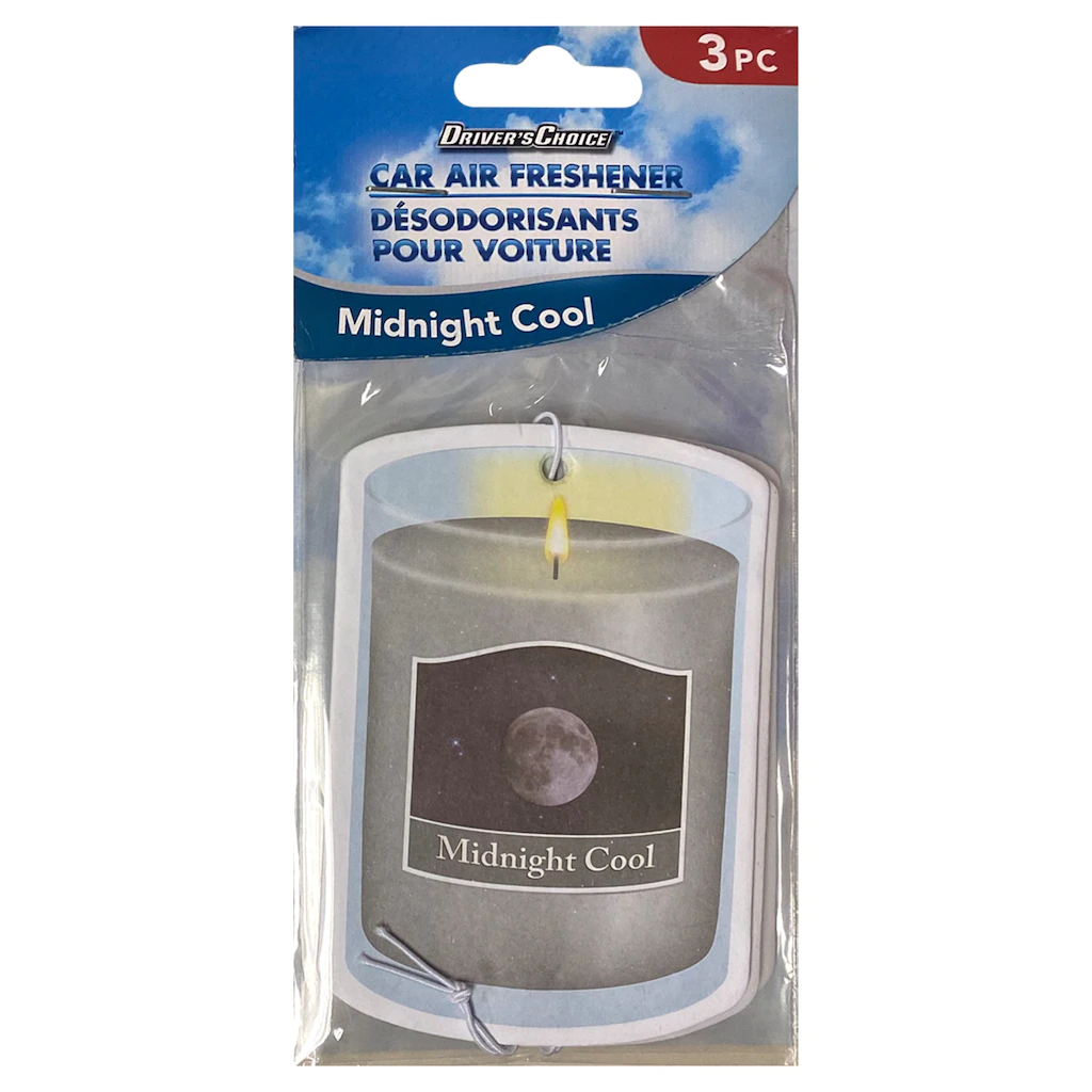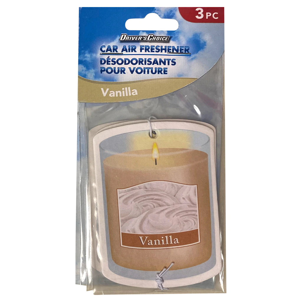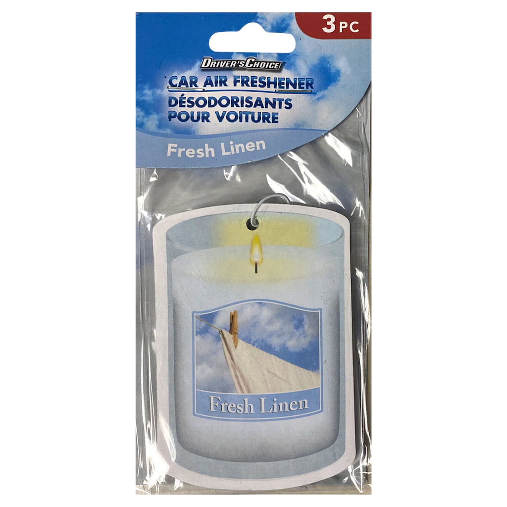Assortment Details: 3-ct. Packs of Drivers Choice™ Scented Air Fresheners assorted among Fresh Linen, Midnight Cool, New Car, and Vanilla scents